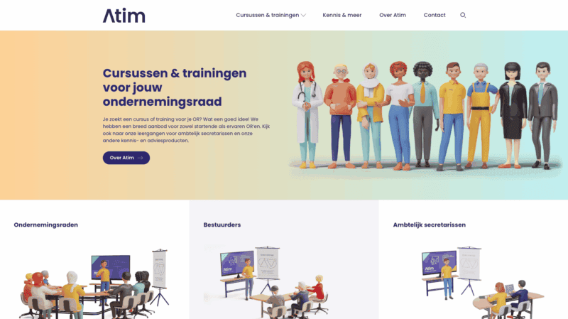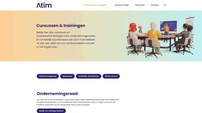Adviesbureau Atim, een advies- en opleidingsbureau gespecialiseerd in het verhogen van de kwaliteit van het werk van ondernemingsraden en ambtelijk secretarissen, wilde een nieuwe website ontwikkelen die beter aansluit bij de behoeften van hun doelgroepen. Het doel? Vergroten van het vertrouwen bij potentiële cursisten klanten, het bieden van heldere informatie en het stimuleren van inschrijvingen. Samen met Adviesbureau Atim hebben we een website gerealiseerd die vertrouwen wekt, informatief is en eenvoudig in gebruik.