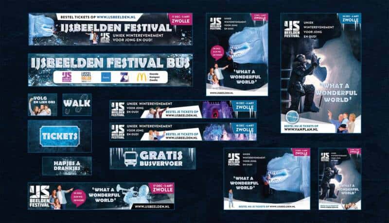 Voor de signing op locatie hebben wij diverse doeken en bewegwijzering gemaakt. Langs de snelweg staat een grote trailer met een reclamedoek voor het IJsbeelden Festival. Ook in diverse kranten en bladen zijn onze advertenties terug te zien. De horeca is aangekleed met mooie winterse sfeerbeelden van vrolijke mensen, glühwein, appeltaart en warme chocolademelk.