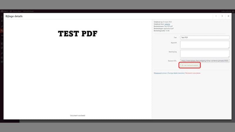 Na het aanklikken van de PDF in de mediabibliotheek opent er een Pop-up scherm, klik in dit scherm op de “URL naar klembord kopiëren” button. Nu heb je de URL naar de PDF in je klembord staan.