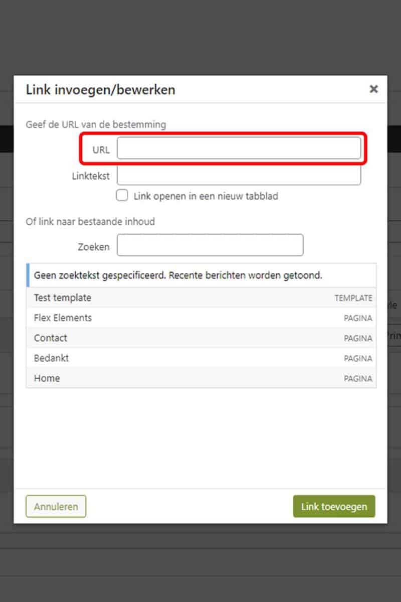 De laatste stap is wat flexibeler omdat er meerder manieren zijn om een link toe te voegen binnen WordPress, dit kan als een (hyper)link maar ook natuurlijk als een button. Dit is natuurlijk verschillend per website echter is het concept het zelfde. Plak de URL die je in de vorige stap hebt gekopieerd in het URL veld bij het toevoegen van een link, in dit voorbeeld wordt de WordPress link module gebruikt. Als de optie er is pas: Vink de “Link openen in een nieuw tabblad” optie aan.